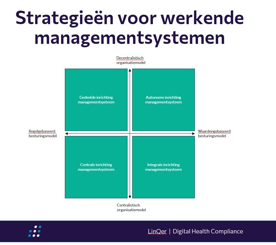Daarom is het belangrijk dat je een strategie hebt waarmee je duidelijke keuzes kan maken, zodat het managementsysteem blijft passen bij hoe je organisatie werkt. Die keuzes moeten aansluiten bij het besturingsmodel en organisatiemodel. Als je die modellen als leidraad neemt, ontstaan er vier strategieën voor een werkend managementsysteem. Hiermee zorg je ervoor dat het systeem altijd in lijn is met je organisatie, ongeacht welke veranderingen er plaatsvinden.
